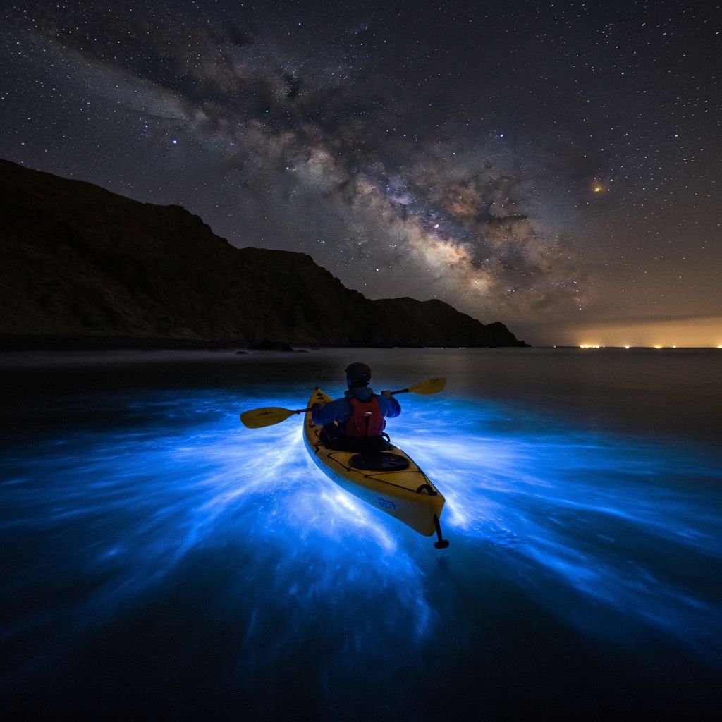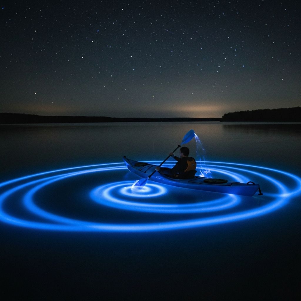 Rema a través de aguas brillantes por la noche mientras millones de organismos bioluminiscentes se iluminan con cada palada.